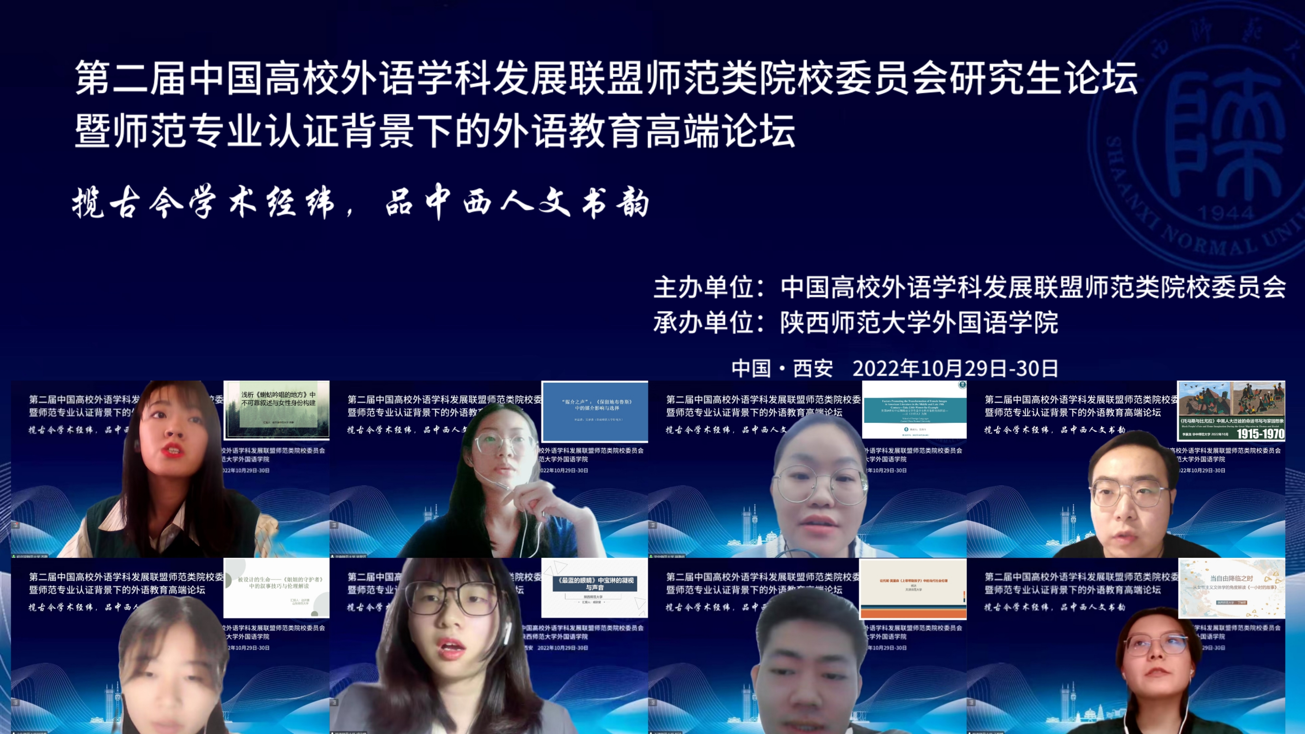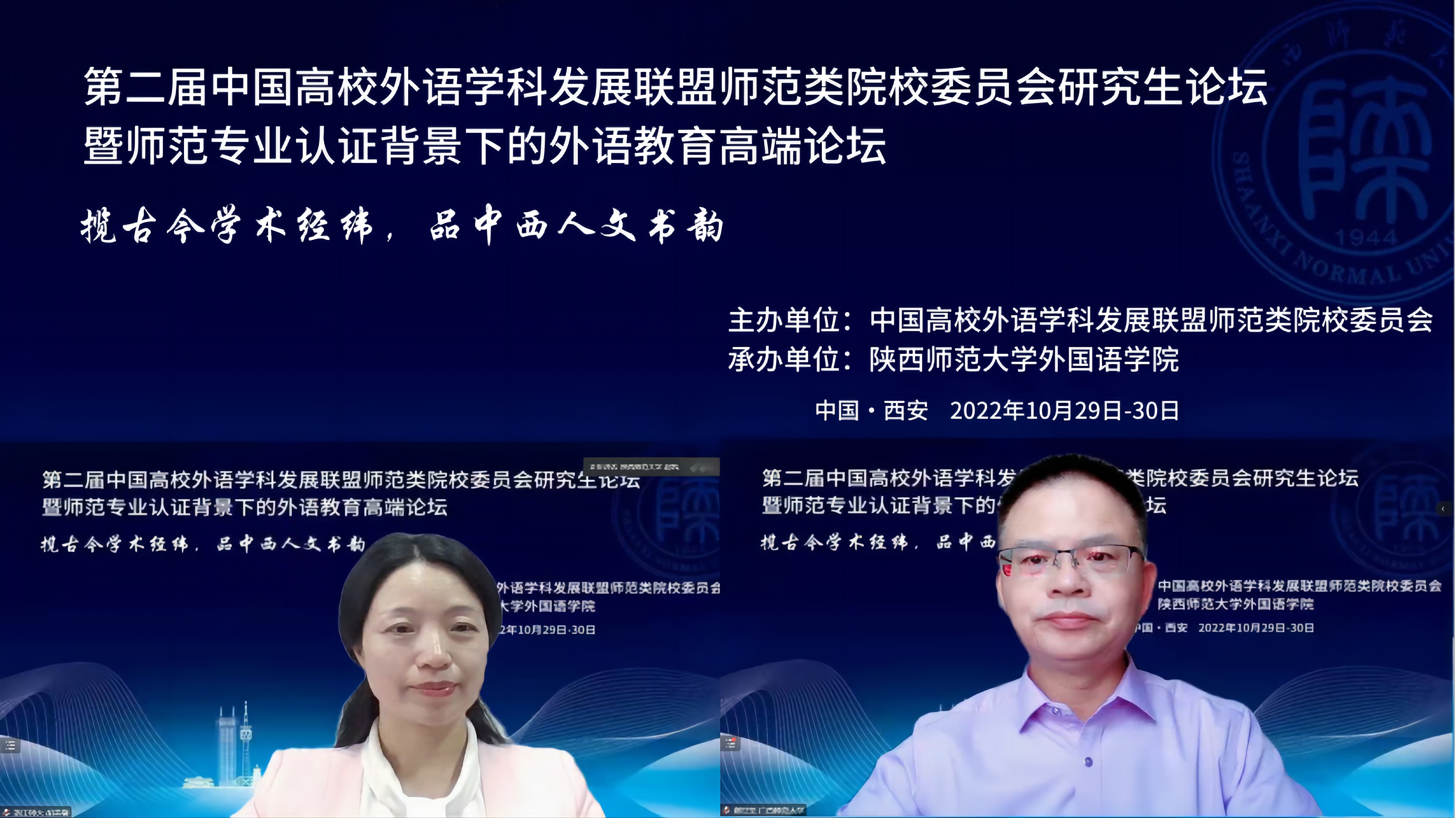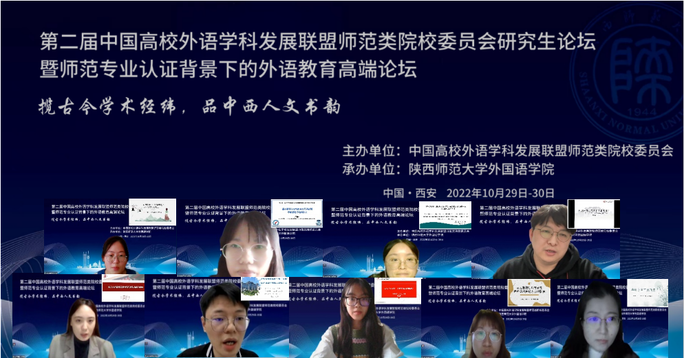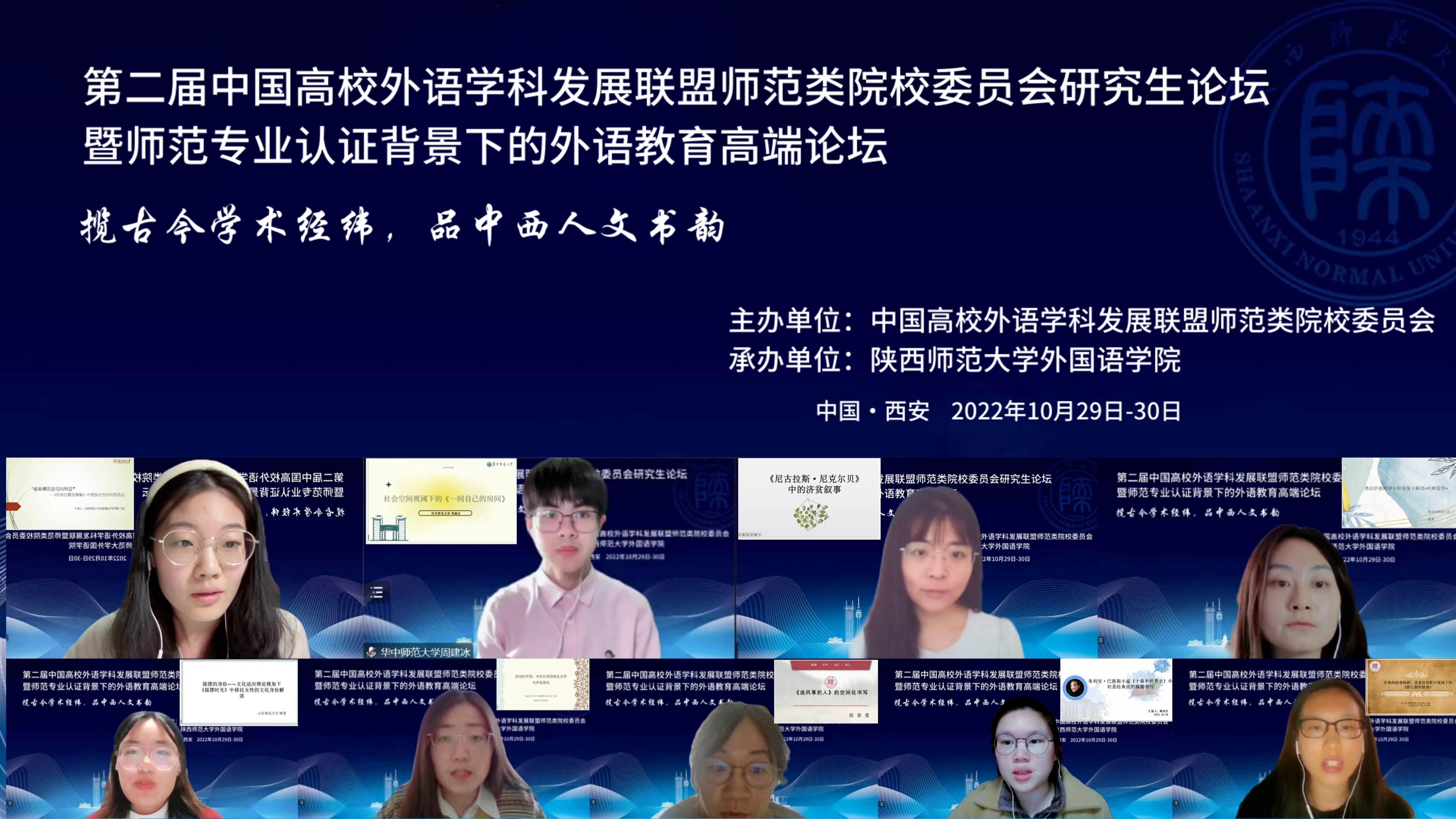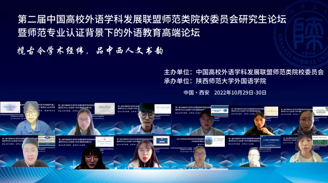 2022年10月29至30日,由中国高校外语学科发展联盟师范类院校委员会主办,太阳成集团tyc234cc承办的“第二届中国高校外语学科发展联盟师范类院校委员会研究生论坛暨师范专业认证背景下的外语教育高端论坛”在线上成功举办。来自近40所院校及科研机构的80余名师生参会发言,另有1000余名师生通过线上观看了论坛盛况。