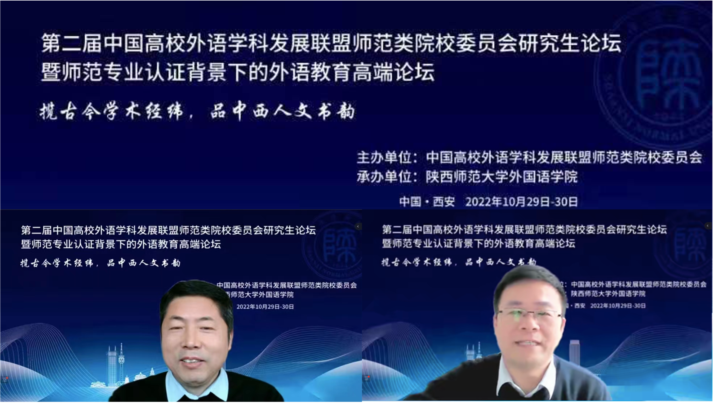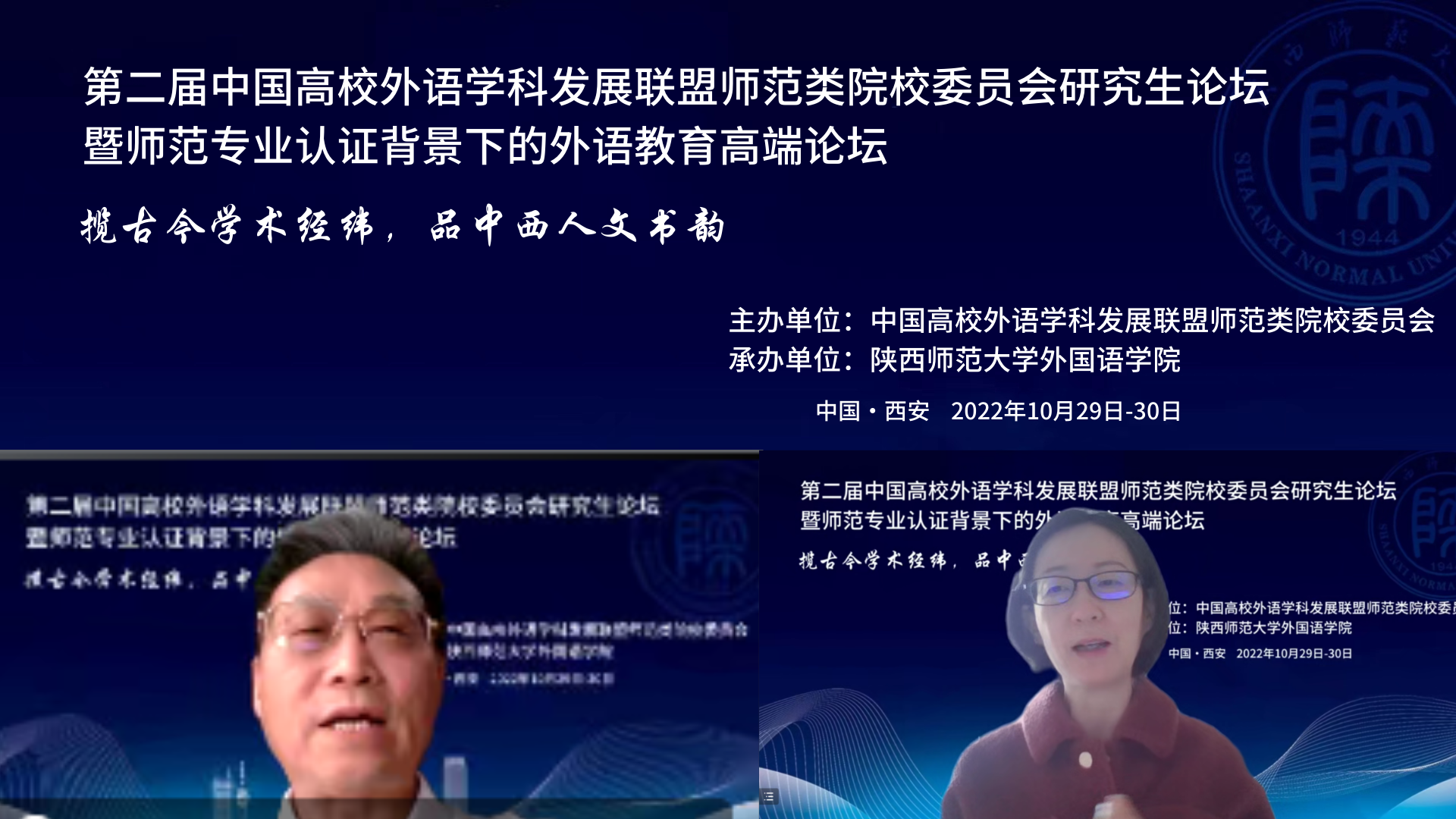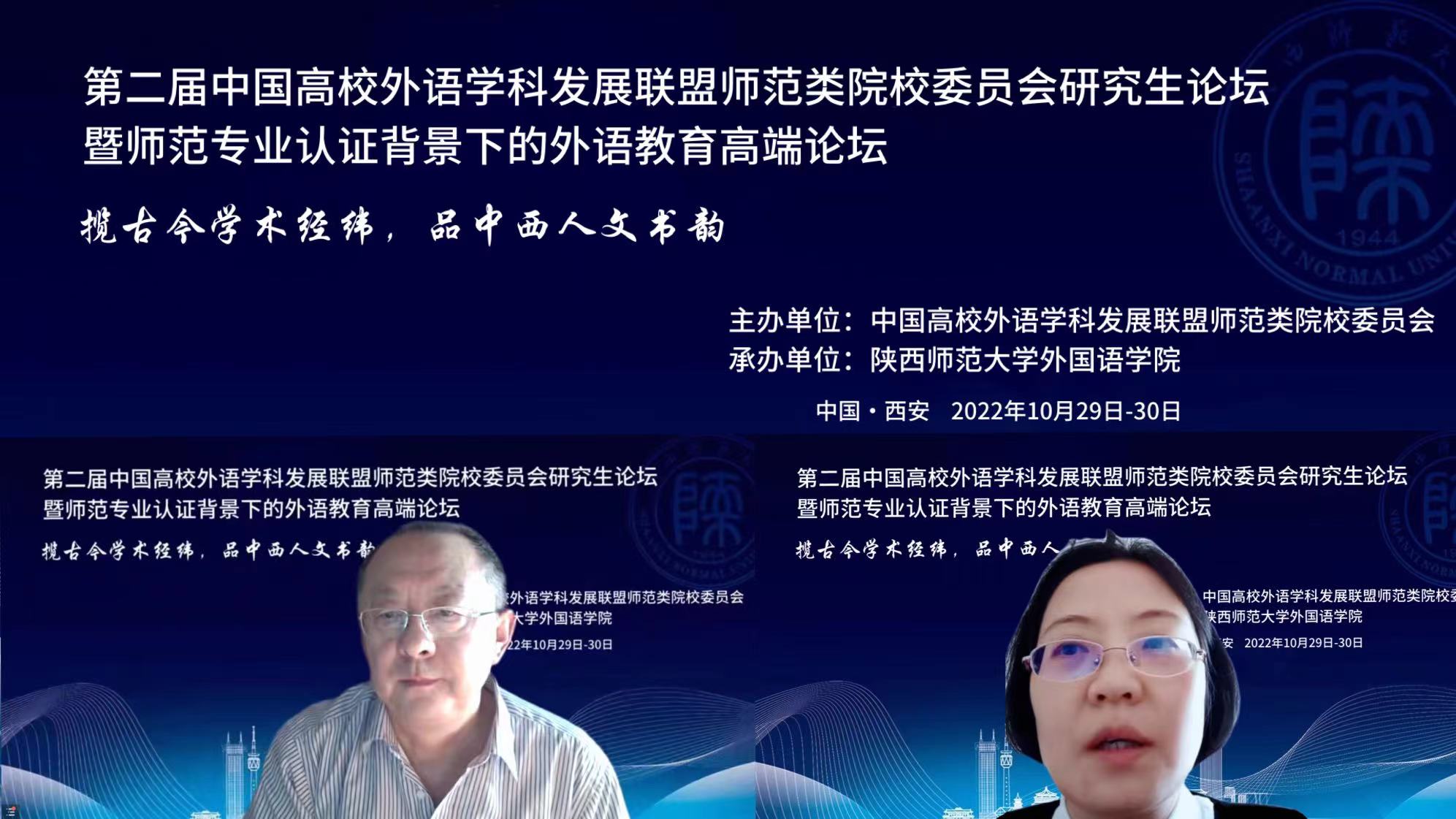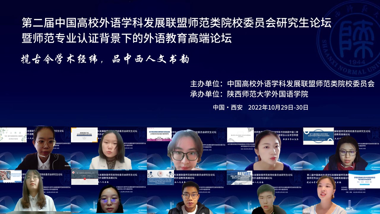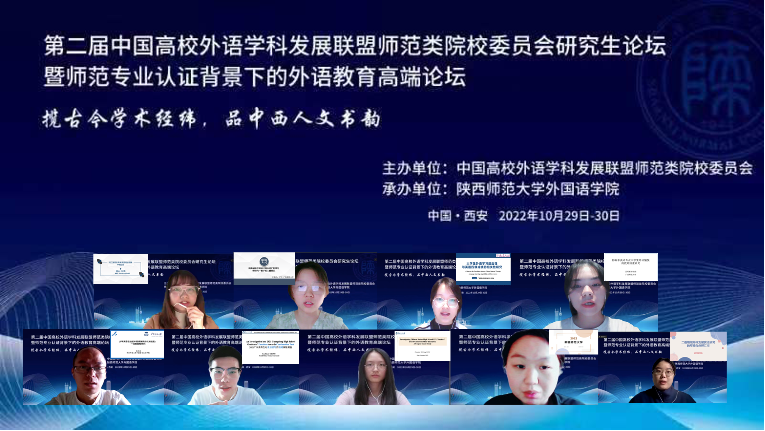 2022年10月29至30日,由中国高校外语学科发展联盟师范类院校委员会主办,太阳成集团tyc234cc承办的“第二届中国高校外语学科发展联盟师范类院校委员会研究生论坛暨师范专业认证背景下的外语教育高端论坛”在线上成功举办。来自近40所院校及科研机构的80余名师生参会发言,另有1000余名师生通过线上观看了论坛盛况。