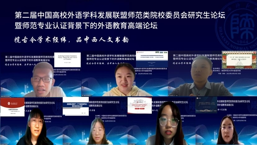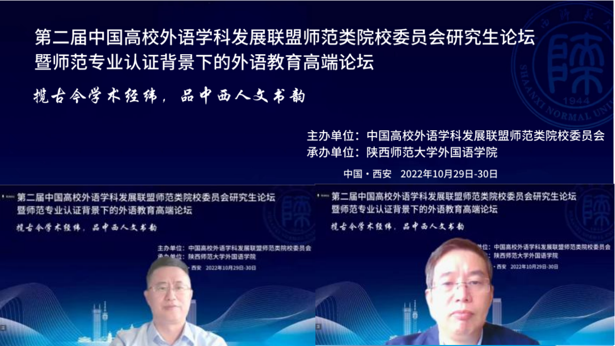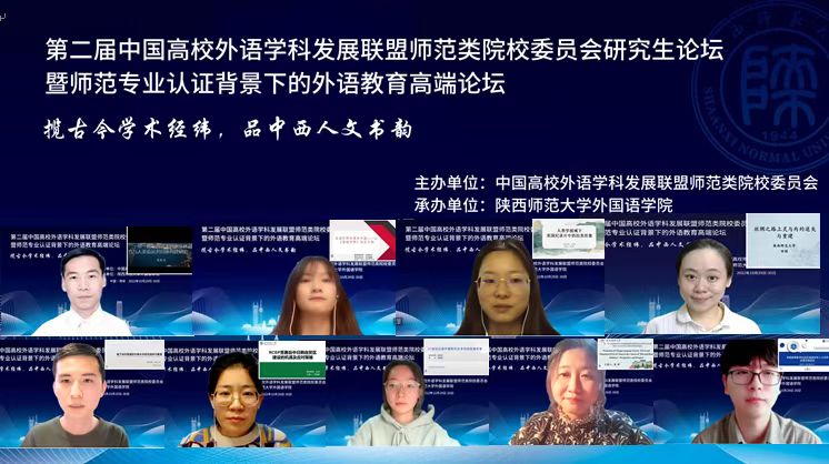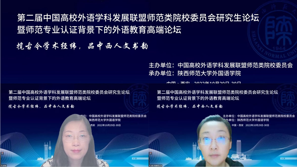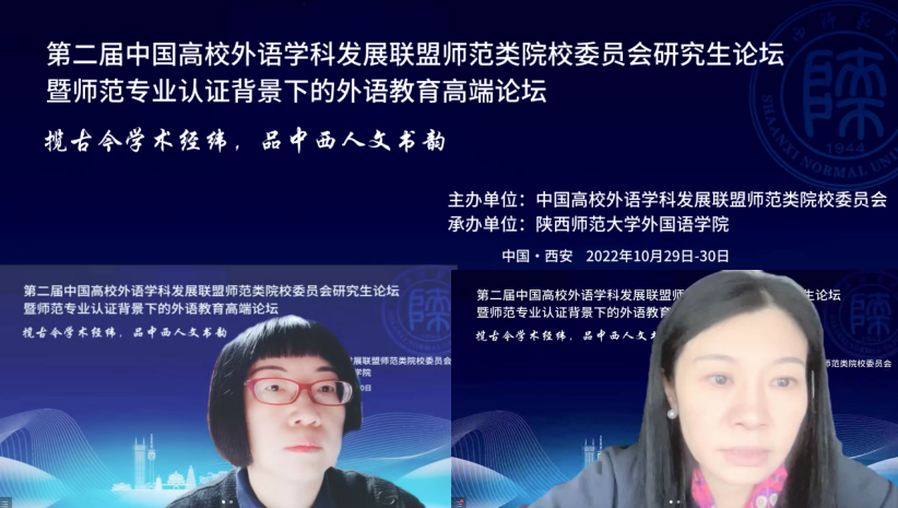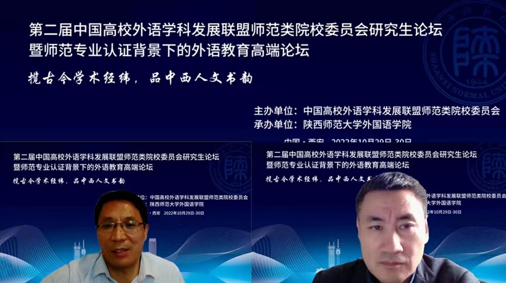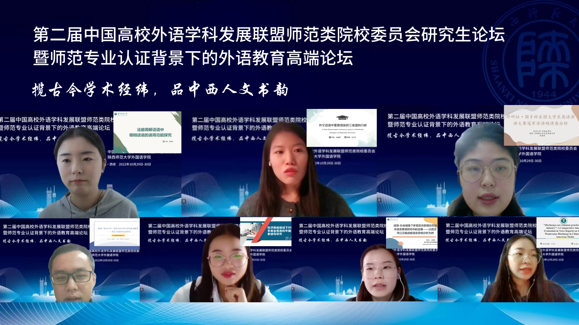 2022年10月29至30日,由中国高校外语学科发展联盟师范类院校委员会主办,太阳成集团tyc234cc承办的“第二届中国高校外语学科发展联盟师范类院校委员会研究生论坛暨师范专业认证背景下的外语教育高端论坛”在线上成功举办。来自近40所院校及科研机构的80余名师生参会发言,另有1000余名师生通过线上观看了论坛盛况。