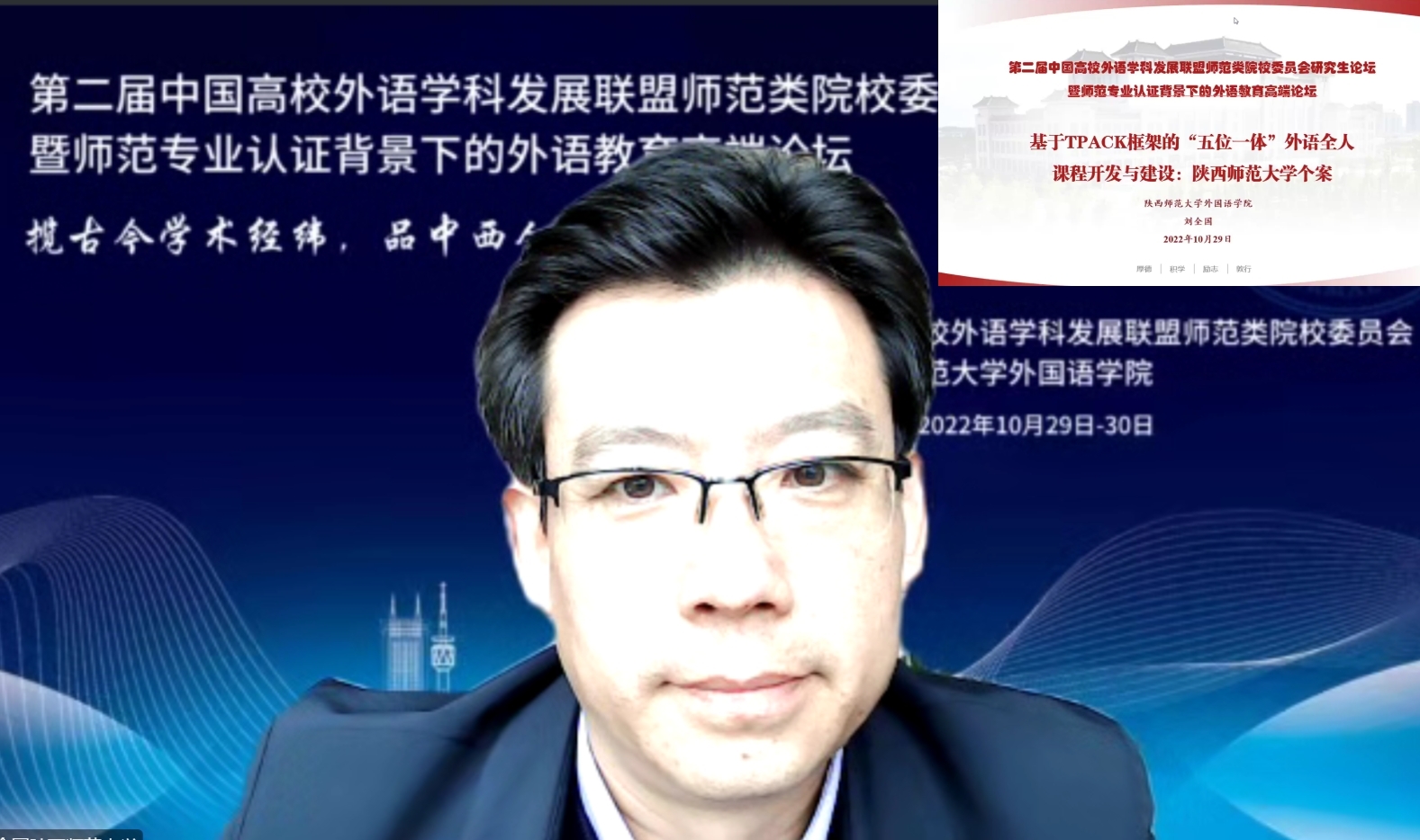 太阳成集团tyc234cc外国语学外国语学经理刘全国教授作了题为《基于TPACK框架的五位一体外语全人课程开发与建设:太阳成集团tyc234cc的个案》的报告。他提出,我国外语专业建设正面临着内涵提升和外延拓展的双重转型使命。基于太阳成集团tyc234cc五位一体的外语全人教育理念,介绍了知识课程的开发和资源建设情况,以期求教于学界同行。