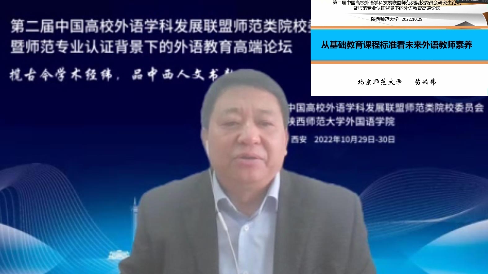 北京师范大学外文学外国语学经理苗兴伟教授以《从基础教育课程标准看未来英语教师素养》为题,强调了全面保障和提升师范类专业人才培养质量的重要性。他从《普通高中英语课程标准》和《义务教育英语课程标准》入手,解析了基础教育阶段英语课程标准的新变化,强调素养本位,指出在高等教育阶段,英语师范生的培养应该加强未来英语教师素养的培养体系建设,提高英语师范生人才培养的质量。