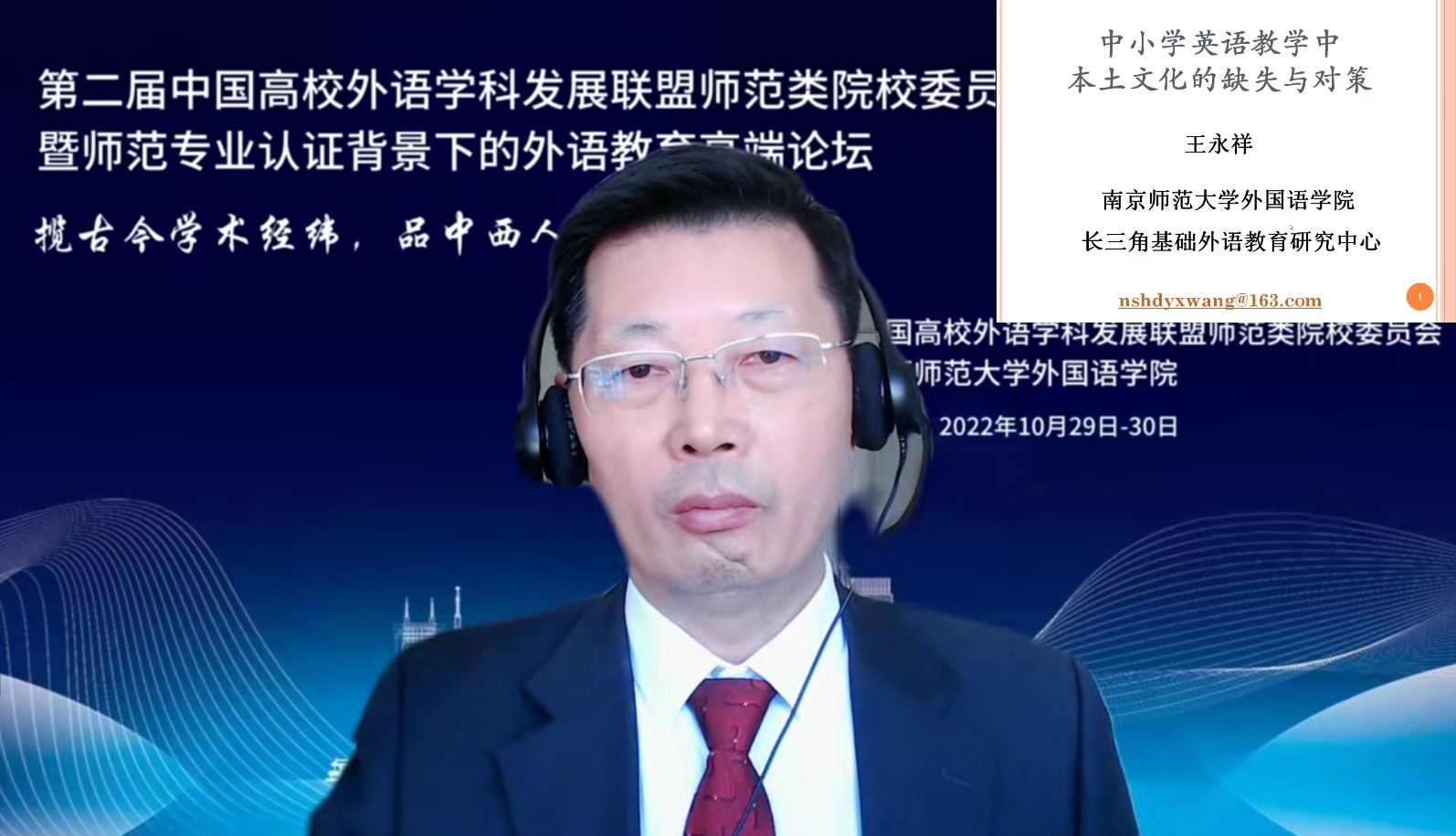 南京师范大学外国语学外国语学经理王永祥教授作了题为《中小学英语教学中本土文化的缺失与对策》的报告。从《义务教育英语课程标准(2022年版)》修订着眼,王教授对中小学英语教学现状进行了反思,从教材、教师、员工以及英语语言测试的角度,分析了中小学英语教学中本土文化的缺失问题,并就如何将本土文化融入中小学英语教学展开讨论。