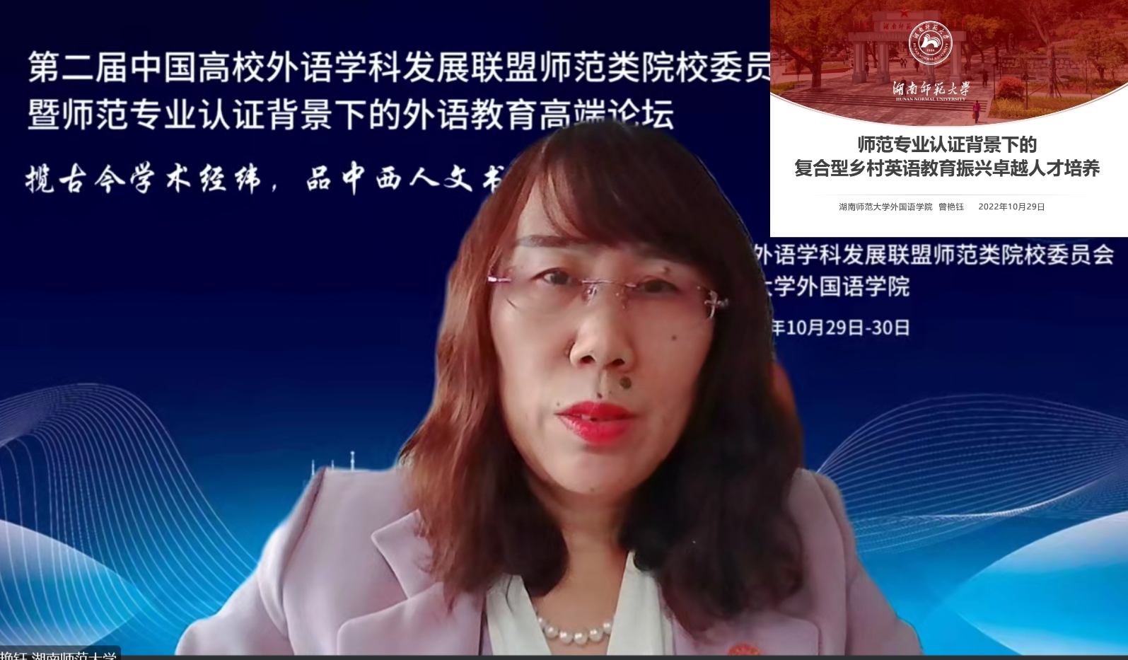 湖南师范大学外国语学外国语学经理曾艳钰教授以《师范专业认证背景下的复合型乡村英语教育振兴卓越人才培养》为题,分析了我国乡村英语基础教育中存在的乡村英语教师教育发展较缓、英语学科与其他学科融合不够、培养复合型人才不足等问题。曾教授认为师范院校英语专业应服务国家乡村振兴战略,发挥院校专业特色,创新和完善教学模式,提升高校英语专业员工竞争力。