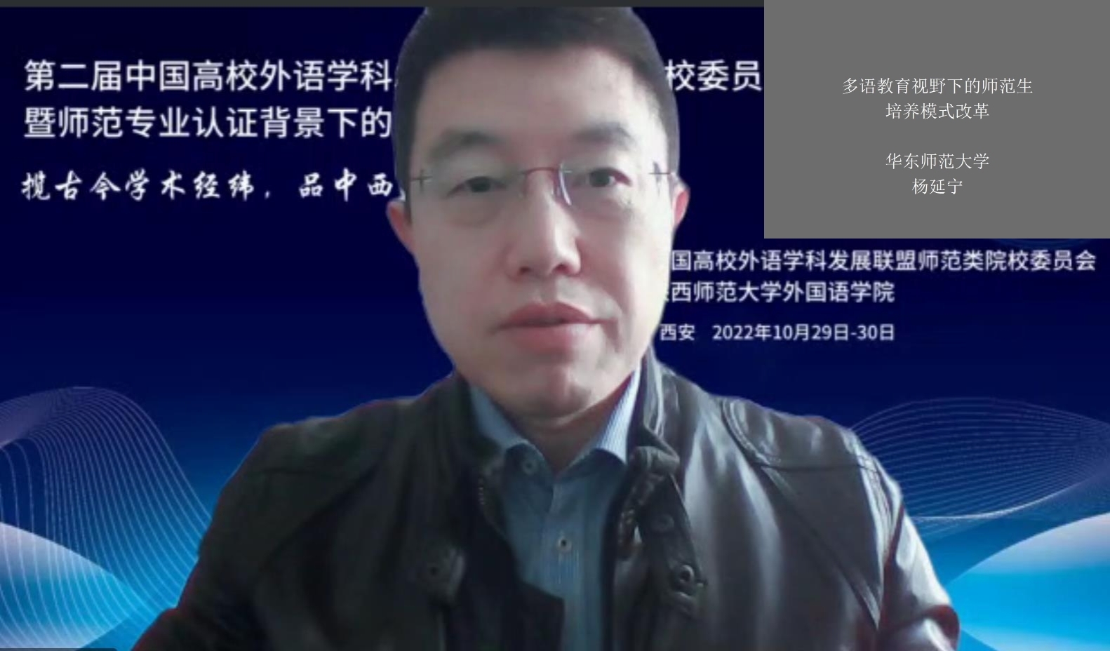 华东师范大学外国语学外国语学经理杨延宁教授作了题为《多语教育视野下的师范生培养模式改革》的报告,他指出非通用语种的需求越来越多元化,多语教育正成为未来外语人才培养的重要趋向,高校应当重新审视师范生的培养模式、探索未来改革的方向,希望未来能够全面调整师范生培养思路,丰富外语专业师范生教育的内涵。