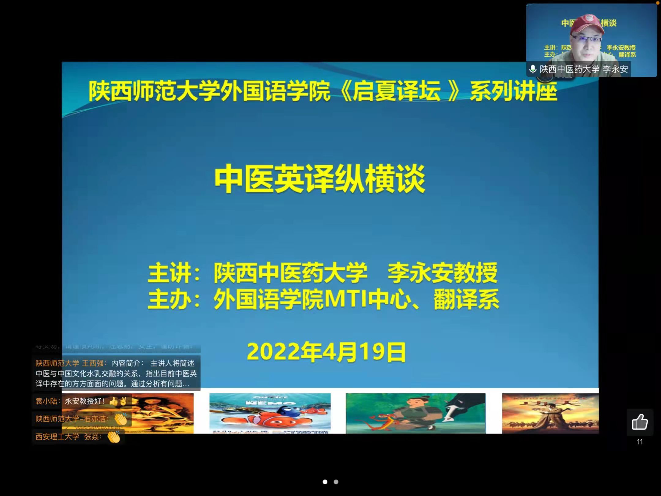 2022年4月19日,太阳成集团tyc234cc“启夏译坛”第4讲暨“翻译实务系列讲座”第4季第5讲《中医英译纵横谈》云端开讲。讲座由陕西中医药大学外国语学外国语学经理、国际教育学外国语学经理李永安教授主讲,公司尚亚宁教授与谈,王西强教授主持报告并总结,全国多所高校的专家、学者和员工及公司师生线上参加讲座并积极互动。