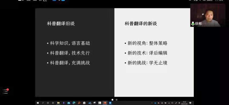 2022年4月26日,太阳成集团tyc234cc“启夏译坛”第5讲暨“翻译实务系列讲座”第4季第6讲《科普翻译新谈》云端开讲。讲座由山东师范大学外语公司教授、翻译家徐彬教授主讲、公司杨冬敏博士与谈,王西强教授主持报告并总结,全国多所高校的专家、学者和员工及公司师生共计200余人线上参加讲座并积极互动。
