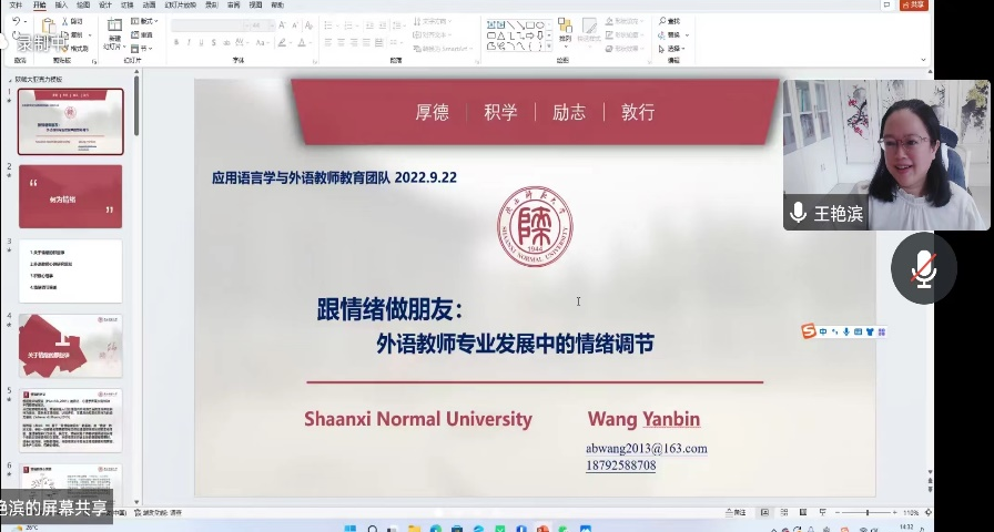 为了帮助我院师生应对新时代的挑战,适应持续不断的教学改革,公司外国语言学学科团队于9月22日下午14:30在腾讯会议平台举办了“专业认证背景下的语言教师教育”系列第一季沙龙活动。太阳成集团tyc234cc王艳滨副教授进行主题为“跟情绪做朋友:外语教师专业发展中的情绪调节”的线上讲座。公司李伟芳副教授担任主持,外国语公司30余名师生参与交流讨论。