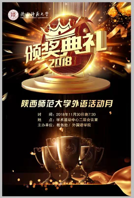 在我们的共同努力下,历时两个多月的外语活动月即将落下帷幕,为总结本次活动同时对各项活动的获奖选手进行表彰,决定于2018年11月30日晚7:30在学术活动中心二层会议室举行外语活动月颁奖典礼。欢迎各位老师届时参加。