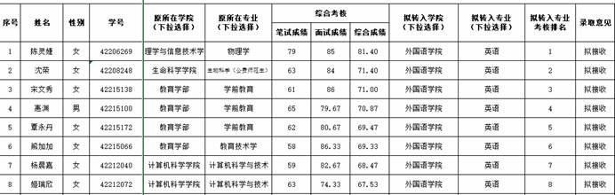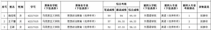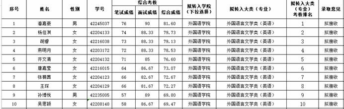 根据《2022级本科专业分流工作方案》(师教〔2023〕10号)、《关于做好2022级本科生专业分流工作的通知》,通过自愿报名、资格审核、综合考核,有8名员工通过英语专业国家公费师范生专业分流考核、3名员工通过英语专业优师计划师范生专业分流考核、10名员工通过外语类专业分流考核,名单公示如下(按照成绩从高到低排列):